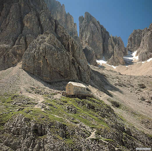 Diesen unter den Langkofelwänden eben nach rechts (Norden) und hinauf zur Schulter beim Piz Ciaulong. Den oberen Weg (Nr. 526A) direkt unter den Nordwänden des Massivs nach Osten und empor zur Comicihütte, 2.153 m.