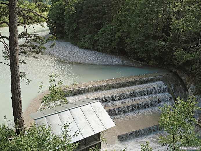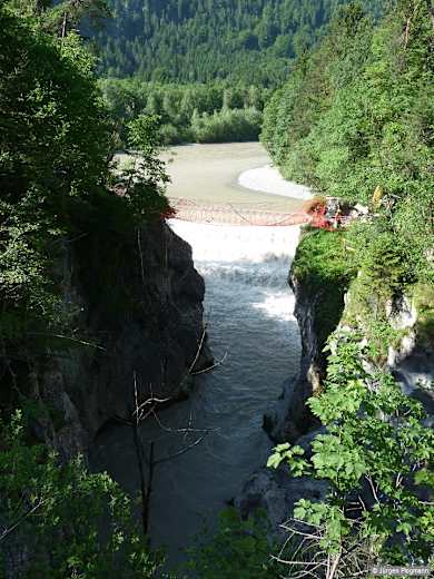 Bevor der Lech seine Wassermassen in das Voralpenland ergießt, stürzt er am Lechfall in einer kurzen, engen Klamm über eine Felsstufe 12 m in die Tiefe. Foto: Jürgen Plogmann, Rother Bergverlag Bildergalerie (8)