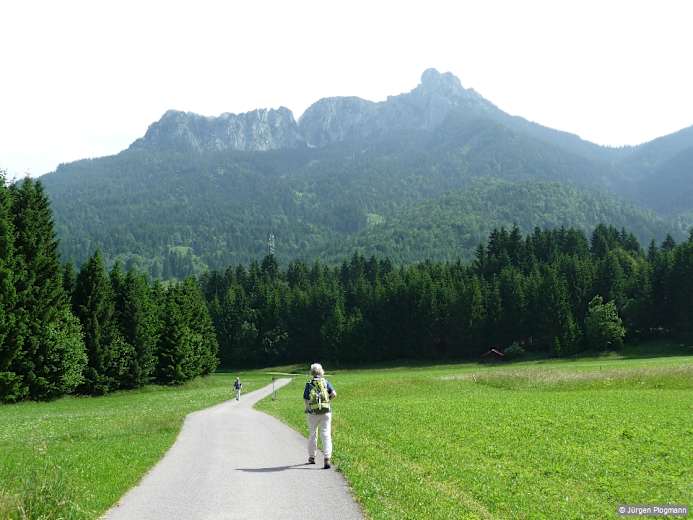 In Pflach, 840 m, folgen wir von der L 69 dem Hinweisschild zum Bahnhof. Auf einem asphaltierten Güterweg gehen wir mit Blick auf den Säuling vor uns durch Wiesen.In Pflach, 840 m, folgen wir von der L 69 dem Hinweisschild zum Bahnhof. Auf einem asphaltierten Güterweg gehen wir mit Blick auf den Säuling vor uns durch Wiesen. Foto: Jürgen Plogmann, Rother Bergverlag