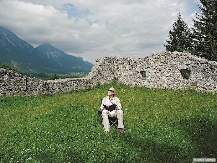 Wir kreuzen die Königsstraße, 856 m (WW bis Fall bzw. Kalvarienberg 15 Min.). Nur 100 m weiter biegt der Lechweg rechts in einen breiten Schotterweg ein, der sogleich einen großen Platz mit zwei Kletterfelsen berührt. Der Weg ist leicht ansteigend und der Sonne ausgesetzt. Nach etwa 500 m leitet uns links ein Pfad durch Felssturzgelände in gut 5 Minuten zum Kalvarienberg, 953 m (Rastplatz, Aussicht), hinauf. Unter den Kreuzen genießen wir den Rundblick.