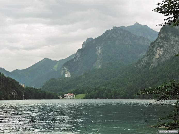 Nun halten wir uns links und werden den Alpsee auf dem Alpsee-Rundweg im Uhrzeigersinn halb umrunden. Es öffnen sich Blicke auf die Königsschlösser und den Säuling über dem See. Wir passieren das Monument zu Ehren der bayerischen Königinmutter Marie. Immer wieder bieten sich Bänke an. Ging es zunächst eben am Ufer dahin, so steigt der Weg schließlich hoch über den See gegen die Fürstenstraße auf, wobei der Aussichtspunkt Pindarplatz passiert wird. (Nach rechts in 10 Minuten bis Hohenschwangau.)
