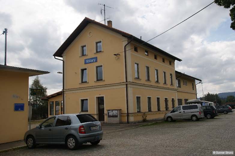 Wir folgen dem Waldweg mit Grün geradeaus, queren die Bahnstrecke zwischen Lenora und Volary und kommen dann nach leichtem Aufstieg zum Punkt Pod Liskovým vrchem. Hier kommt Blau von rechts heran, wir gehen mit beiden Markierungen nach links weiter. Unser Weg verlässt den Wald und wendet sich in rechtem Winkel nach links. Wir durchqueren nach etwa 250 m ein kleines Wald- und Buschstück, und gleich danach biegt Blau (mit Grün) im spitzen Winkel nach rechts auf einen kaum erkennbaren Pfad ab, führt etwas empor und auf ein einzelnes Haus zu. Direkt davor wendet sich der Weg durch einen Obstgarten nach rechts und bringt uns durch eine idyllische kleine Allee zu den Ruinen des Gehöfts Brixův Dvůr. Hier biegen wir nach rechts ab und wandern auf der alten Straße nach Lenora nach Volary hinein. Bald kommen wir auch zur neuen Straße nach Lenora (Staatsstraße 39). Wir gehen auf ihr nach rechts und biegen nach etwa 150 m nach rechts in die Straße U Nádráží (Am Bahnhof) ein. Über sie gelangen wir nach etwa 350 m zum Bahnhof von Volary, von dem wir mit dem Zug die Rückfahrt nach Lenora antreten.