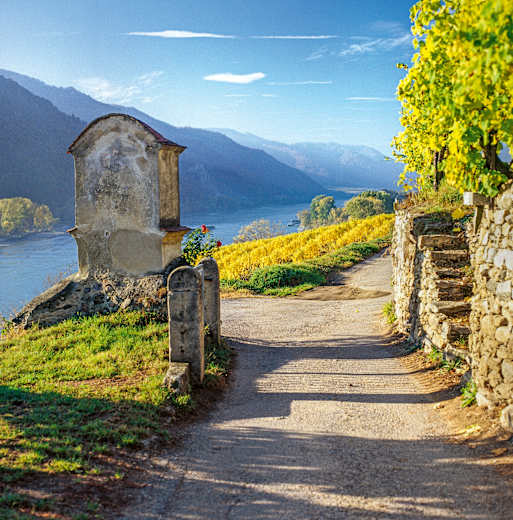 Südwärts durch das Weinbaugebiet gehen wir auf der querenden Asphaltstraße uns links haltend bergab zu einer Verzweigung, dort die Straße 100 m nach links hinab zum Bildstock Hinterseiber, 362 m. Belohnt werden wir mit einem Tiefblick in das Donautal, auf Dürnstein und Weißenkirchen.