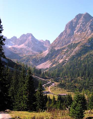 Zurück zum Ausstieg des Klettersteigs hält man sich rechts und folgt dem versicherten Steig über steiles Schrofengelände bis zur südlichen Parzinnscharte. Zwischen Steinkarturm und Parzinnturm steigt man nun weiter auf einem versicherten Steig ab. Achtung, die Rinne ist zum Teil sehr geröllig (B). Schließlich gelangt man wieder auf den Zustiegsweg und folgt diesem zurück zur Steinseehütte.