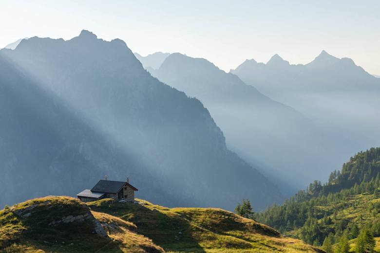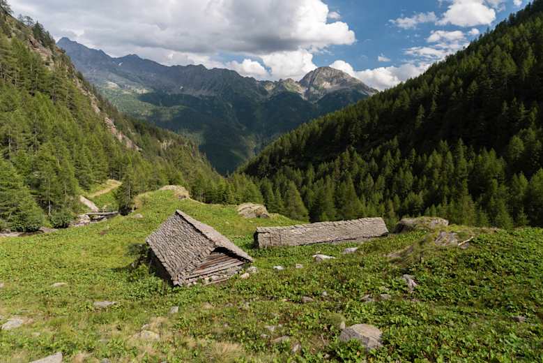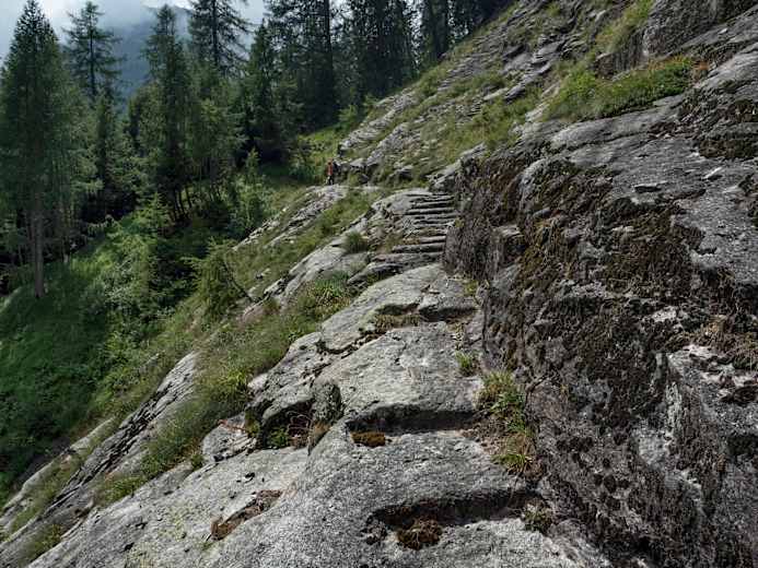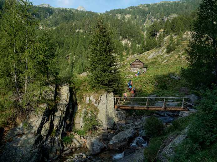 Gestärkt und ausgeruht schlendert man durch die Gassen von Fusio, diesem am Hang klebenden Bergdorf mit so traditioneller wie ungewöhnlicher Architektur. Aber nicht allzu lange: Es wartet eine grosse Etappe. Der Weg steigt durch Lärchenwald an, folgt einem Felsband und entführt in die abgeschiedene Welt der Alpe di Röd. An mehreren Stafeln und Weiden vorbei gelangt man zur Bocchetta di Pisone – der seit Jahrzehnten kaum mehr benutzte Übergang ist dank diesem Trekking neu zu entdecken. Vor einem öffnet sich das Valle di Peccia, das Tal des Marmors.