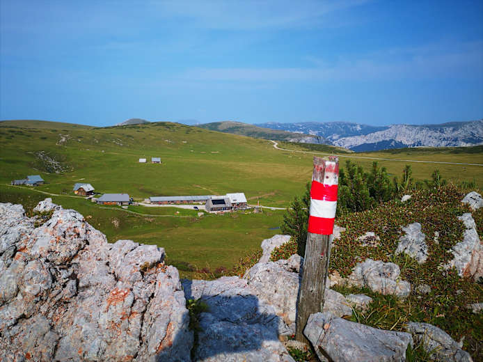 Die gemütlichere Variante führt uns von der Knopperwiese rechtshaltend auf dem markierten Weg zum Windberg (1.903m, höchster Punkt der Schneealm) und von dort abwärts zu den schon sichtbaren Schneealmhütten. Dort (Michlbauerhütte oder, etwas weiter entfernt, bei der Lurgbauerhütte oder am Schneealmhaus) machen wir gerne Rast.