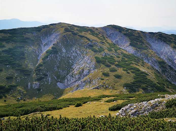 Bald stehen wir auf der Hochfläche (rechts kleine Almhütte) und folgen links dem nun teilweise grün markierten Steig zur Knopperwiese. Hier müssen wir uns entscheiden - wollen wir das Schönhaltereck besteigen (lange Variante), so verlassen wir beim Wegweiser den markierten Steig und gehen links aufwärts (unmarkiert, tw. Steinmänner) über den Punkt 1.864m auf einem teilweise latschenbewachsenen Rücken in Richtung Schönhaltereck. Durch eine Senke geht es zuletzt aufwärts zum schon sichtbaren Gipfelkreuz. Retour zum Wegweiser auf der Knopperwiese am gleichen Weg, bei Nebel schwierige Orientierung!