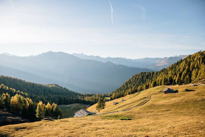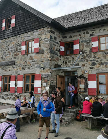 Vom Gipfel des Hirzer zurück zur Oberen Scharte am Grat (7). Vom Grat auf dem Gebirgsjägersteig (E5) über Geröll und felsige Stellen ziemlich steil zur Tallner Alm hinunter (E5), weiter zur Bergstation Klammeben (40a).