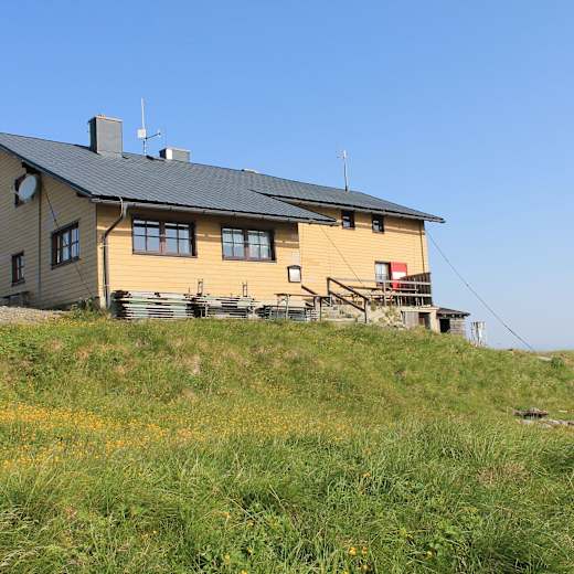 Nun halten wir uns links und wandern bergauf zum Niederwechsel. Wieder links vorbei an einer Gedenkstätte für Soldaten wandern wir entlang des markanten, felsigen Höhenrückens bergauf bis zum Wetterkoglerhaus. Das Wetterkoglerhaus befindet sich am Gipfel des Hochwechsel mit seinen 1.743 m.