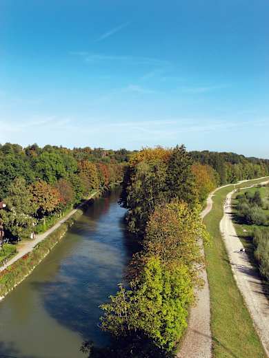 Um die Wanderung fortzusetzen, biegen wir nach der Kanalbrücke links ab und spazieren flussabwärts entlang der Isar, bis wir nach ca. 30 Minuten eine große Holzbrücke erreichen. Wir überqueren diese und sind nun am südlichen Ende des Tierparks Hellabrunn. Wie bei Variante 1 wandern wir zum Parkplatz zurück.