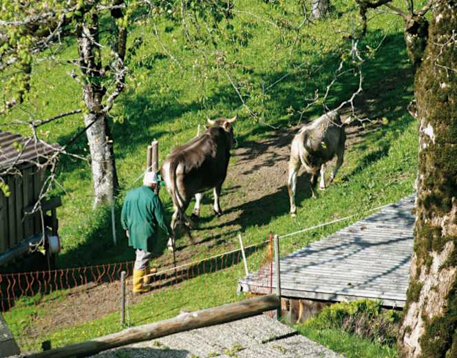 Vor den Alpgebäuden der Oberen Wüstealpe heißt es die Augen offen halten, damit man die Markierungspflöcke nicht übersieht die direkt nach links durch die Alpweide führen. Entlang eines Bächleins, das man etwas später überquert, gelangt man auf einen Güterweg, der uns zunächst zur Unteren Wüstealpe und weiter hinab zur Sonntagsweide bringt. Von dort folgt man dem Netschelweg bis zur Unteren Leuealpe (1.120 m), wo man ihn wieder verlässt.