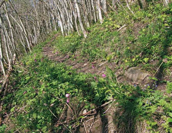 Ein Waldpfad führt steil hinunter zur Frutz und jenseits des Baches genauso steil wieder bergan zur Kirche von Laterns-Thal.