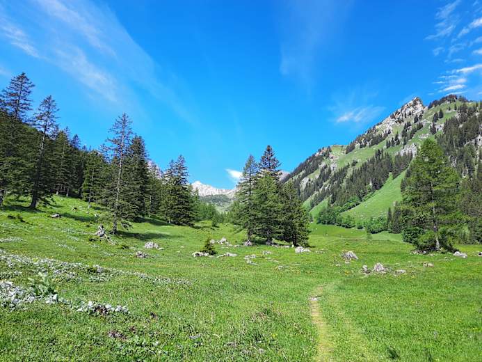 Der Weg startet im Ortsteil Innertal und führt über einen Wanderweg entlang des Palüdbaches ins malerische Zalimtal bis zur Unteren Brüggele Alpe, welche zur Einkehr einlädt. Retour über den gleichen Weg oder entlang der Forststraße.