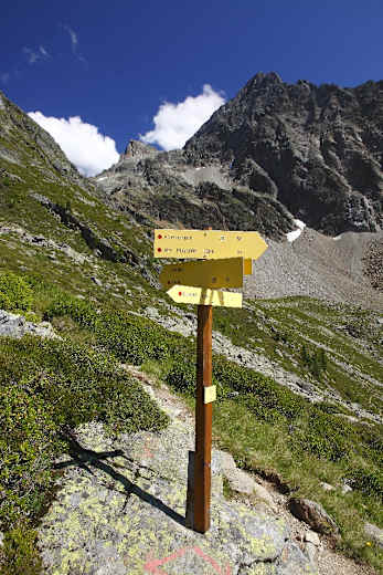 Zunächst mit der Acherkogelbahn nach Hochoetz, 2.020 m, und von dort zur neuen Bielefelder Hütte, 2.112 m. Bei der Gabelung oberhalb der Hütte halten wir uns rechts und folgen dem guten Flankensteig mit wenig auf und ab bis kurz vor die Ruine der 1951 durch eine Lawine zerstörten alten Bielefelder Hütte, 2.193 m.
