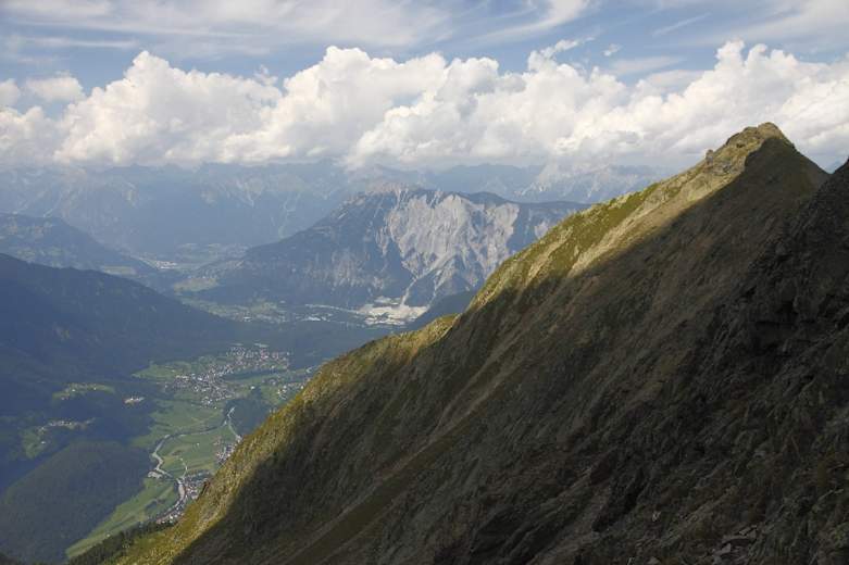 Über die Mittertaler Scharte Steiganlage mit alpinem Anstrich (vereinzelt Drahtseile). Der Kühtaier Höhenweg verläuft im Bereich der Waldgrenze an Almen vorbei (T2, blau). Neben etwas Trittsicherheit vor allem Ausdauer notwendig.