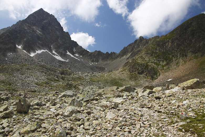 Hier zweigen wir scharf links ins Karle ab, orientieren uns ziemlich weit nach links an die Abhänge des Windeggs und steigen zuletzt mit Drahtseilhilfe durch eine Rinne bis in die Mittertaler Scharte, 2.631 m, empor. Jenseits zunächst ebenfalls an Sicherungen abwärts. Der Steig wird aber bald hindernisarm und führt auf einen blockbesetzten Boden. Links haltend schaltet sich eine Reihe von Kehren an einem Steilstück dazwischen, ehe man über den Bach auf die rechte Seite des Mittertals wechselt (ohne Brücke bei starkem Wasseraufkommen eventuell heikel).