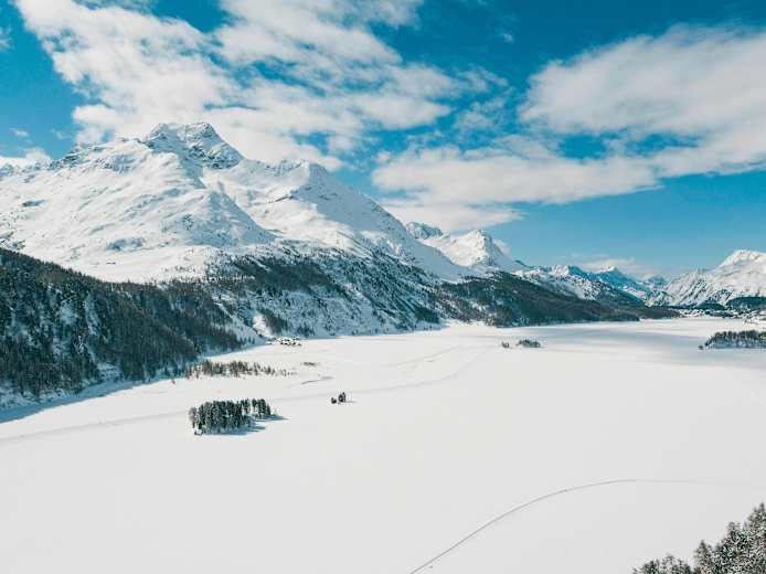 Schöne Winterwanderung für kalte Tage über dem Silser See im Kanton Graubünden inmitten der beeindruckenden Gipfelwelt der Berninagruppe. Die Weite, die Ruhe und das Panorama der mächtigen Gipfel machen die Tour auf den Spuren des Engadin Skimarathons zu einem ganz besonderen Erlebnis für Jung und Alt.