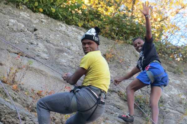 Zunächst waren es vorwiegend Iraker und Syrer, mittlerweile sind auch viele Somalier fleißig am klettern. Wir teilen die insgesamt 20 Leute meistens in gleichsprachige Gruppen, einfach damit die Verständigung leichter geht. Einmal haben wir sie aber bunt durchgemischt – was auch gut geklappt hat. Manche versuchen sich auf Englisch zu verständigen, andere mit ein paar Brocken Deutsch – und wenn alles nicht geht, dann eben mit „Händen und Füßen“ (lacht).