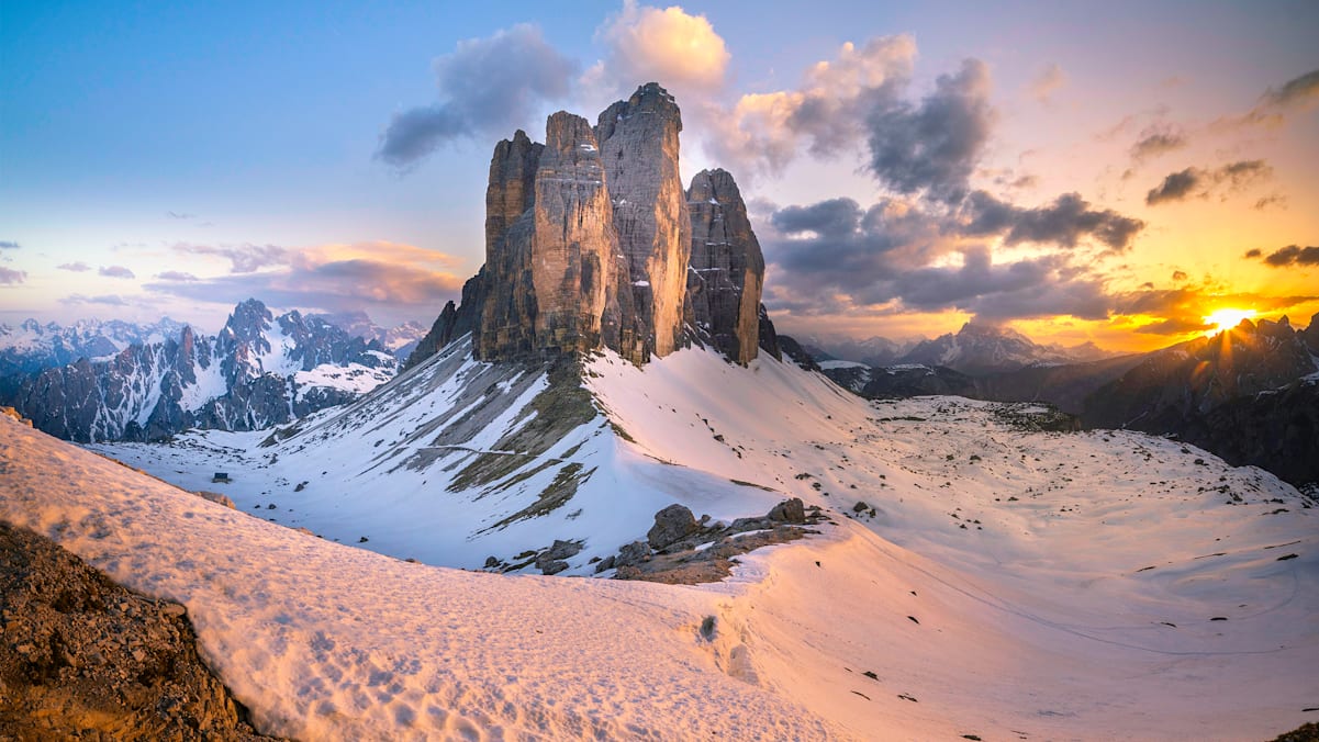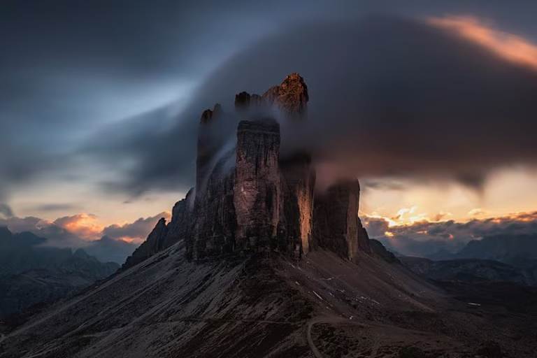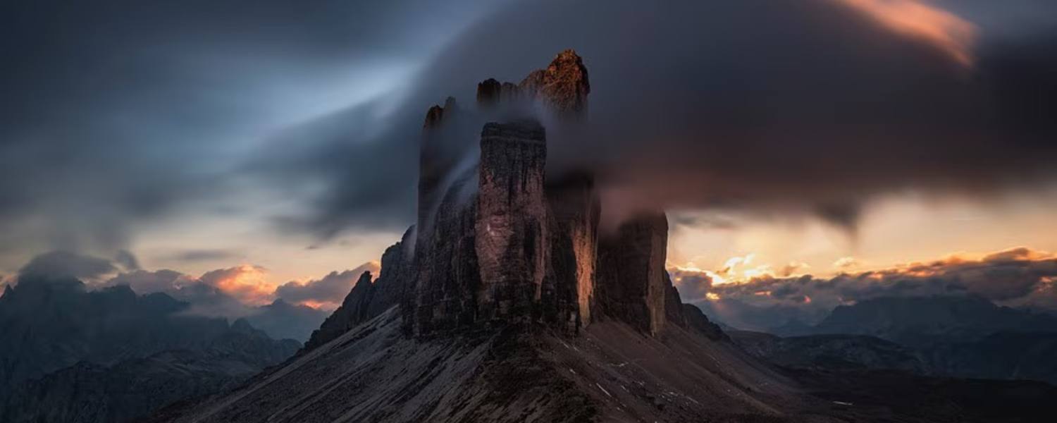 Zu einer einzigen zusammengefaltet zeigen sich die Drei Zinnen, auf Italienisch Tre Cime, wenn man sie von Osten betrachtet. Folglich sehen wir im Vordergrund die stark zergliederte Kleine Zinne (2.857 m) mit der Punta di Frida hinter einer Nebelschliere. Davor hebt sich trutzig der Preußturm (2.700 m) ab, benannt nach seinem Erstbesteiger, dem Wiener Klettergenie und Free-Solo-Pionier Paul Preuß. Folgen wir dem Fußweg nach links, so gelangen wir zur Auronzo-Hütte. Nach Norden breitet sich das weitläufige Grava-Longa-Plateau mit den Zinnenseen aus.