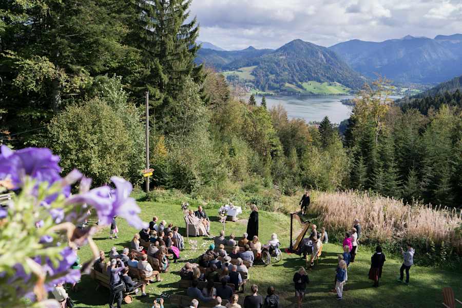 Im Almbad Huberspitz kann man sogar standesamtlich heiraten – mit einem zauberhaften Blick auf den Schliersee! Man kommt am Freitag an und wandert gemütlich eine halbe Stunde zum Almbad, während der Shuttle, der auch gebrechliche Personen mitnimmt, das Gepäck nach oben bringt. Samstag wird dann gefeiert und Sonntag ist Abreisetag. Bei der Suche nach einem Standesbeamten, der richtigen Torte und der Klärung aller weiteren Fragen rund um die Hochzeit sind die Mitarbeiter gerne behilflich und stehen dem Brautpaar bei der Organisation zur Seite. Das Almbad hat für bis zu 70 Gäste Platz, auf der Terrasse nochmals für über 80 und bis zu 30 Personen können hier übernachten. Auch im nahen Almbad Silberghaus finden (freie) Trauungen auf der idyllischen Almwiese statt.