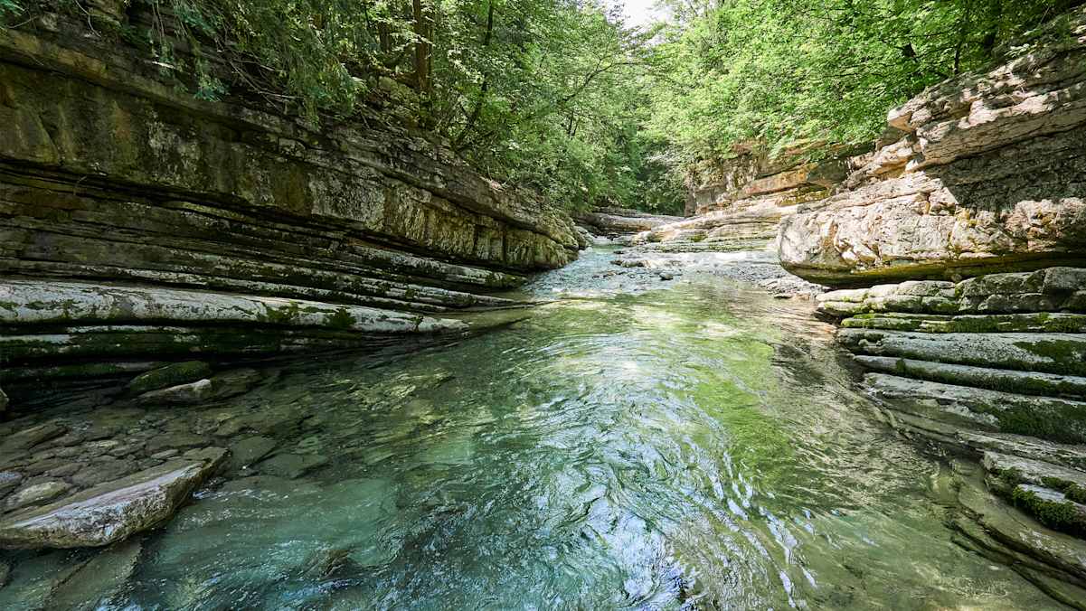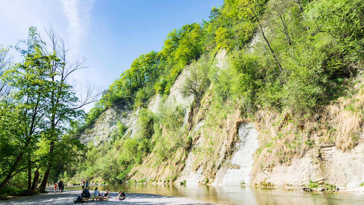 An ein paar Stellen ist das Wasser tief genug, um von den Felsen reinzuspringen. In den Sommermonaten kann an Wochenenden nahe der Römerbrücke einiges los sein. Ein Stück flussaufwärts werden die Schluchten enger und die Badegäste weniger.