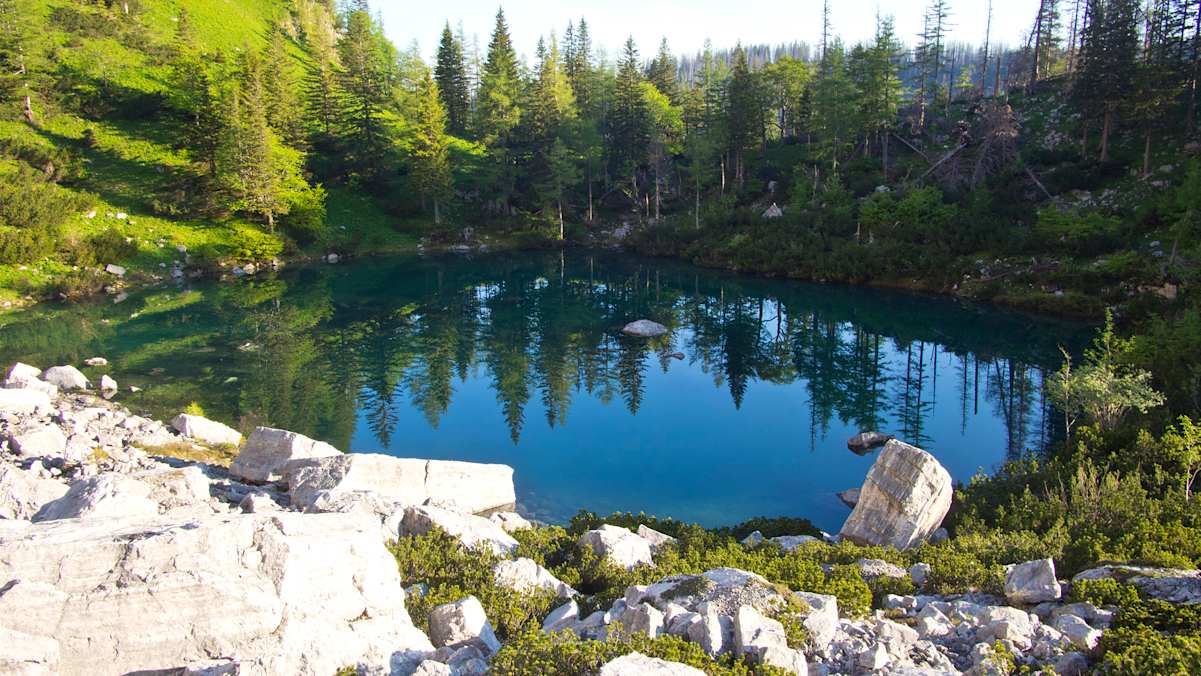 Wer die Feichtauseen in ihrer ganzen Pracht sehen will, muss sich schon ein bisschen anstrengen. Der Aufstieg auf das Nockkar lohnt sich allerdings, denn am schönsten sehen die beiden smaragdfarbenen Bergseen im Nationalpark Kalkalpen von oben aus.