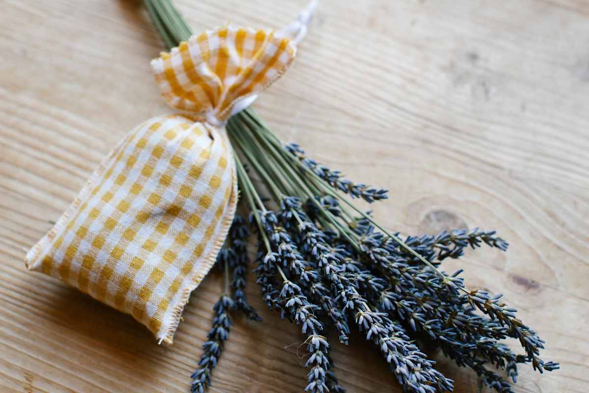 Ein Stoffkissen (zum Beispiel aus alter Bettwäsche selbst genäht) mit getrockneten Lavendelblüten füllen und mit einem Bändchen zubinden. Übrigens: Lavendelduft vertreibt nicht nur Motten, sondern auch Stress und Sorgen.
