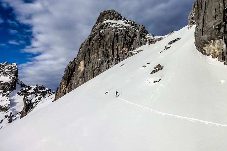 Am Talboden wird wieder aufgefellt und es geht retour zur Hütte und ab dort mit dem Rucksack hoch zum Drusentor. Ca. 300 m rechts des eigentlichen Tors liegt eine etwas steilere Zickzack-Variante zu einem höher gelegenen Durchgang. Vorteil dieser Variante ist, dass der nordseitige Hang bereits weiter oben gefahren werden kann. Man trifft, je nach Verhältnissen, auf perfekten Powder oder Harsch – ein Jausenstop in der Scharte ist sicherlich keine schlechte Idee.