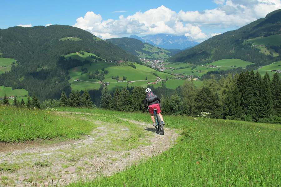 Zunächst geht’s vom Freischwimmbad in Oberau gemütlich nach Auffach, wo man in die Gondelbahn steigt. Am Schatzberg beginnt die eigentliche Bike-Tour: Über eine abwechslungsreiche Route gelangt man ins benachbarte Alpbachtal. Am bekannten Dorf Alpbach vorbei und weiter über die Bischoferalm und das Hauserjoch geht es wieder in Richtung Wildschönau.