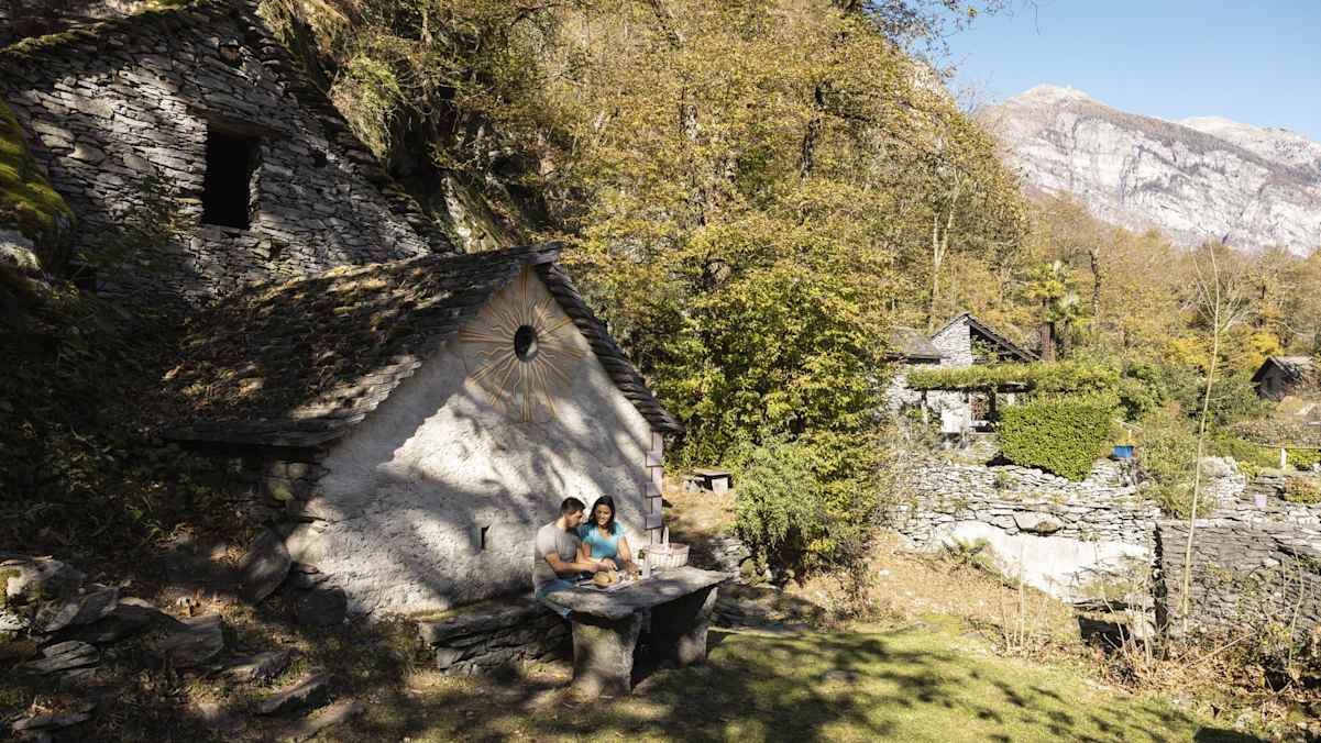 Bergwelten-Tipp: Im Geschäft Val Magìa in Cevio, dem Hauptort des Maggiatals, kann man sich einen Korb mit regionalen Tessiner Spezialitäten vorbestellen und diese beim Picknick in einem schattigen Grotto genießen.