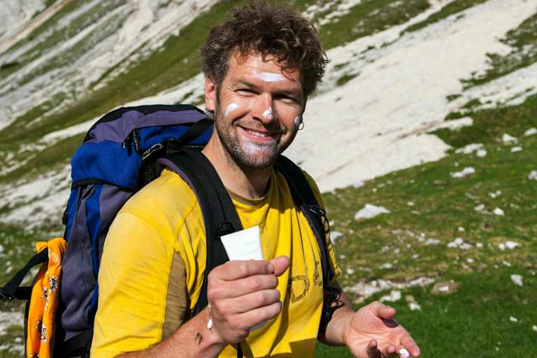 Beim Losgehen eincremen? Das ist eher spät: Sonnenschutz muss einwirken – auch damit er nicht mit dem Schweiß vom Gesicht ins Shirt rinnt. Ihn eine halbe Stunde vor Start der Tour aufzutragen ist sinnvoll, früher nicht, denn die Schutzwirkung soll lange anhalten. Je nach Hauttyp und Lichtschutzfaktor legt man etwa alle zwei Stunden nach. Nicht fettende Produkte, etwa rasch einziehende Gele, und Schutzstifte für sensible Stellen sind für Outdoor-Aktivitäten eine gute Wahl.