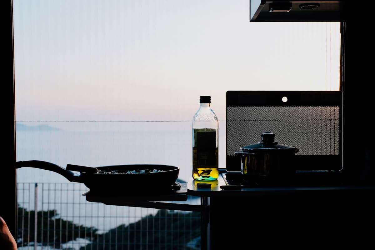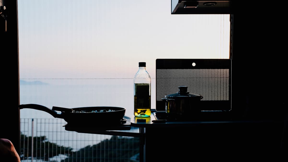 Entschleunigung in allen Ehren, aber manchmal mussten selbst wir auf die Tube drücken (hüstel-hüstel!): beim Kochen. Und was haben wir es abgefeiert. Zum betanken parkt man den Camper direkt vorm Supermarkt, der bis zur Ladekante gefüllte Einkaufswagen verschwindet ohne Umwege in den Einbauschränken und wenn einen der kleine Hunger packt, legt Person A (Conny) schon los mit zwei Pfannen, während Person B (Clemens) noch die Handbremse zieht – und Person C (Oskar) nörgelt, weil sein Schnulli im Sitz verschwunden ist.