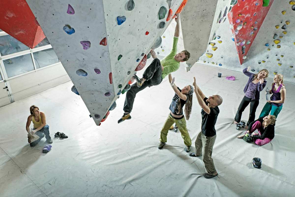 Was beim Bouldern im Freien noch unabdingbar ist: ein sogenannter Spotter, also eine zweite Person, die das unkontrollierte Abstürzen des Boulderers verhindern soll. Der Spotter sorgt dafür, dass der Boulderer im Falle eines Sturzes auf dem Crashpad und möglichst aufrecht – also nicht auf Kopf oder Nacken – landet. In der Halle ist das Spotten meist nicht nötig, da die gesamte Aufprallfläche ohnehin mit dicken weichen Matten ausgelegt ist. Heißt: Man kann auch alleine loskraxeln und ist auf keinen Kletter-Partner angewiesen. Zugegeben, der soziale Aspekt ist beim Bouldern wie in vielen Sportarten ein wichtiger. Trotzdem kann es von Vorteil sein, seinem Hobby auch alleine nachgehen zu können. (Achtung: Auch in der Boulderhalle kann das Spotten sinnvoll sein, beispielsweise bei Boulderproblemen, bei denen Stürze auf Nacken oder Kopf möglich sind, oder beim Bouldern mit Kindern.)