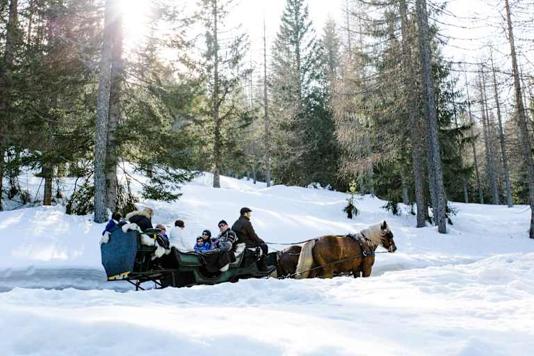 Das Klappern der Hufe hallt über den Asphalt, bis es von knirschendem Schnee gedämpft wird. Pferdeschlittenfahrten sind eine ruhige Möglichkeit, die Winterlandschaft zu erleben. Rund um Tröpolach und entlang der Sonnenalpe Nassfeld führen malerische Routen durch die Natur. Ein besonderes Highlight ist der Abstecher zur Tressdorfer Alm – oder sogar ins nahe Italien – bevor es gemütlich zurückgeht.