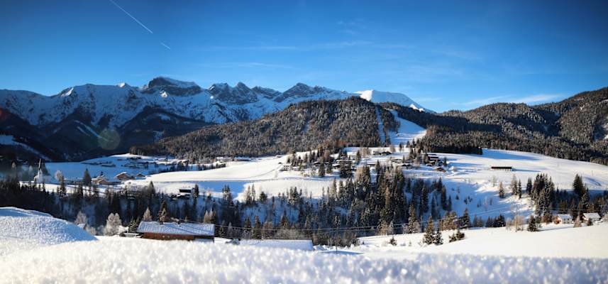 Gemütlich durch den Schnee stapfen ist hier absolutes Pflichtprogramm, zum Beispiel bei einer geführten Almwanderung. Über die Brücke der Pletzach ins Gerntal durchquert man einen Bergwald. Danach geht es weiter über offene Almwiesen der Pletzachalm, die einen weiten Blick über die umliegende Bergwelt erlauben.
