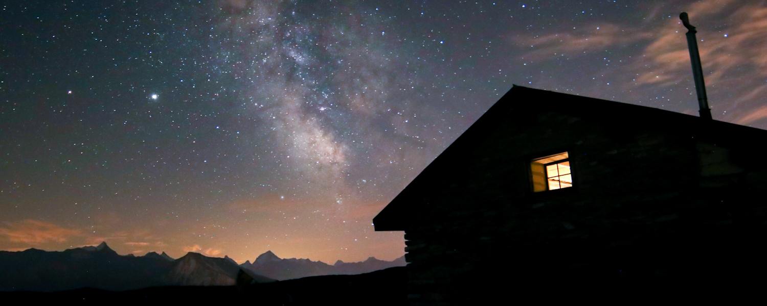 Die dunkelsten Orte der Schweiz verstecken sich in den Alpengebieten. Dazu gehören die Regionen rund um das Münstertal und das Unterengadin. Dort liegt am Ende des langen, stillen Val Tuoi in der Silvretta eine gemütliche Hütte mit blauweißen Fensterläden: die Tuoihütte (2.250m). Was man nach der Hüttenruhe um 22 Uhr machen kann? Den Perseiden beim Vorüberziehen zusehen.