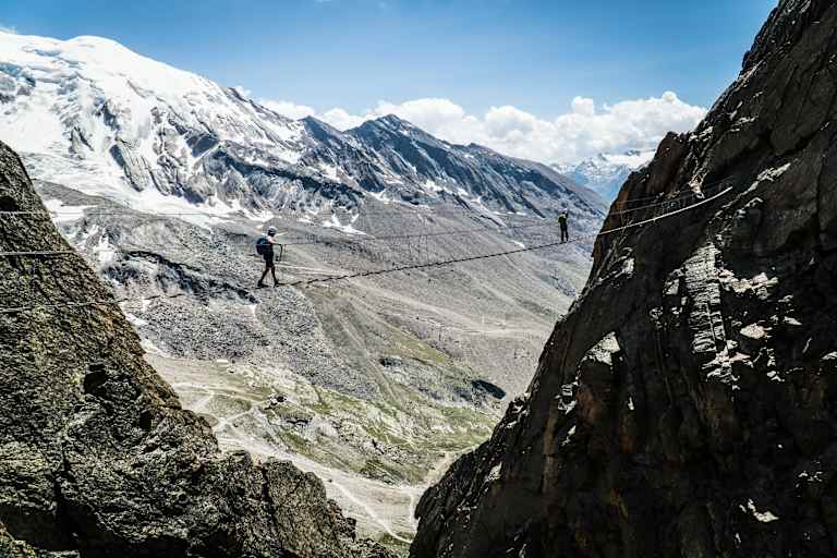 Umgeben von 18 Viertausendern kraxelt es sich auf den Eisenwegen in der Region Saas-Fee/Saastal besonders spektakulär. Vom Übungsklettersteig bis zur Profi-Route: Diese sechs Eisenwege darfst du nicht verpassen!