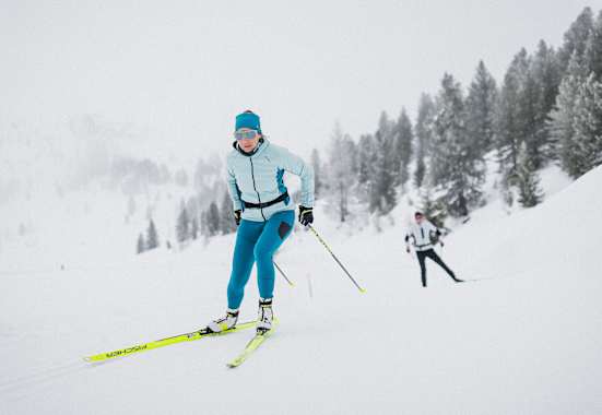 Durch das Fehlen der Bindung verlangt Powsurfen vollen Körpereinsatz. Erst mal positionieren: in die Knie gehen und nach vorne lehnen. Mit den Zehenspitzen und der Ferse wird der Druck verlagert. Wie beim Wellenreiten fungiert der Oberkörper als Steuerrad. In der Theorie easy, in der Praxis enden die ersten Abfahrten nach einigen Metern oft auf dem Po - was im Pulverschnee aber sehr verkraftbar ist.