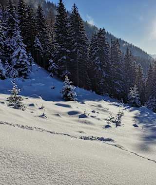 Skitour am Catwalk: Beim Aufstieg hat man die Felswände von Admonter Kaibling, Sparafeld und Reichenstein im Blick, zwischen Klinkehütte und Kaiblinggatterl dann die Rottenmanner- und Wölzer Tauern sowie das Ennstal mit dem mächtigen Dachstein. Allein der Blick lohnt die Tour! Vom Parkplatz Kaiserau folgt man zunächst dem Winterwanderweg in Richtung Oberst-Klinke-Hütte (1.486 m), einer lohnenden Einkehrmöglichkeit, und geht anschließend entlang des markierten Wegs weiter bis zum Kaiblinggatterl. Dort steigt man südlich auf den Kamm und in weiterer Folge den Rücken entlang auf. Bald darauf steht man am Gipfel des Lahngangkogels auf 1.778 m. Für die Abfahrt bieten sich mehrere Möglichkeiten an, entlang des Aufstiegs kann man aber jedenfalls zurück ins Tal schwingen.