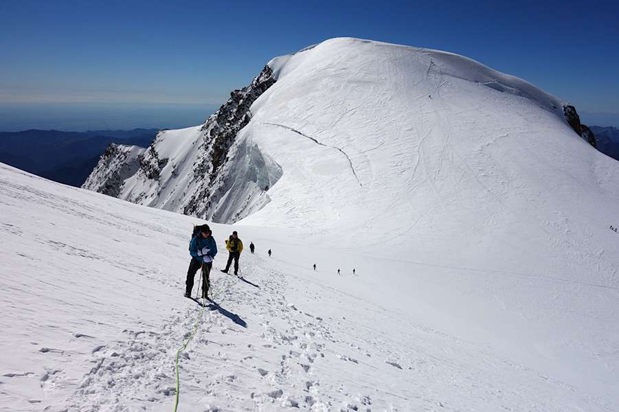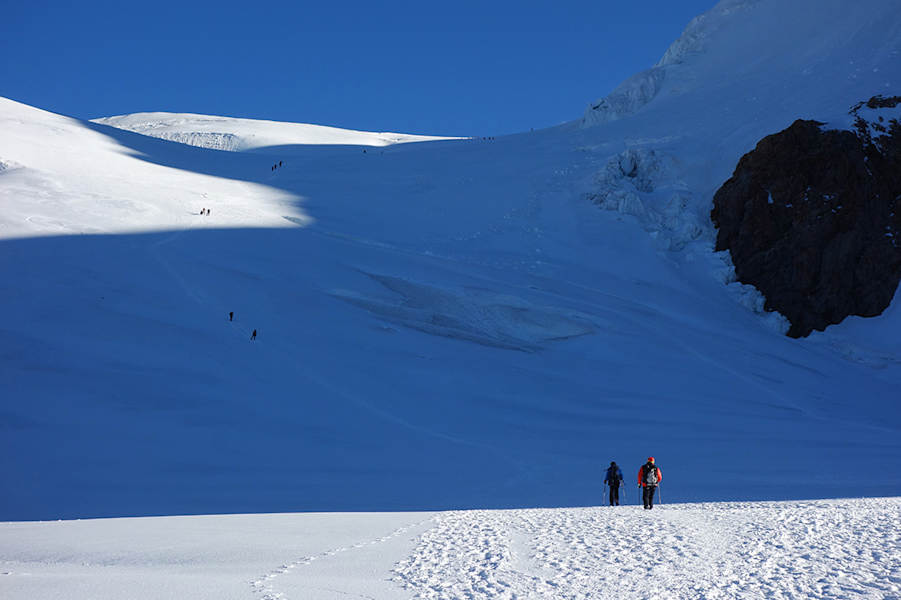 Der zweite Tag beginnt nach Sonnenaufgang. Aufgrund der Länge und der Charakteristik der Etappe ist es nicht notwendig, sich im Schein der Stirnlampe nach draußen zu begeben. Der Aufstieg über den Östlichen Lysgletscher ist technisch einfach. Schritt um Schritt gelangen wir höher und auf etwa 3.900 m Höhe zweigen wir von der Hauptroute nach Osten ab um die Piramide Vincent zu besteigen. Ich stand bereits mehrmals auf diesem Gipfel – meist am Ende der Tour, beim Abstieg von der Signalkuppe. Dieses Mal ist die Pyramide Vincent unser Auftakt und im Vergleich zur Besteigung in umgekehrter Reihenfolge erscheint der Anstieg wesentlich harmonischer. Ralf und Janina geht es verhältnismäßig gut. Sie trinken ausreichend und finden Rhythmus und Durchhaltewillen in unserer Seilschaft. Der teilweise spaltenreiche Gletscher wird den Sicherheitsstandards entsprechend angeseilt begangen. Über Einzelgänger und Gruppen ohne Seil können wir uns nur wundern.