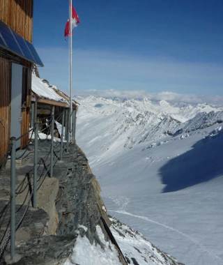 Die Oberaajochhütte schmiegt sich eng an die Felswand des Oberaarhorns (3.629 m) und „hängt“ praktisch 50 Meter über dem Oberaarjoch. Sie ist eine der exponiertesten und spektakulärsten Hütten des Schweizer Alpenclubs mit einer Aussicht, die kaum zu toppen ist. Das Panorama reicht von der Berninagruppe im Osten über alle namhaften Walliser Gipfel wie Dufourspitze, Dom, Matterhorn und Weisshorn bis zum nahen Finsteraarhorn.
