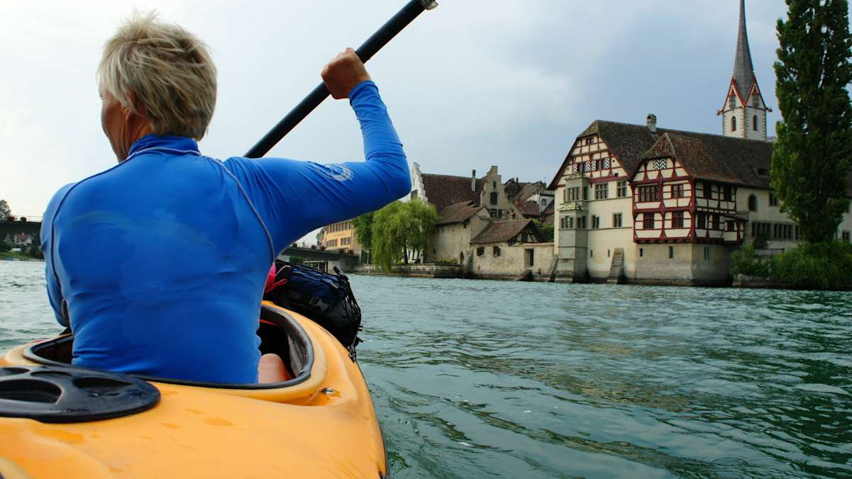 In Schaffhausen endet der erste Flussabschnitt. Ein Kraftwerk sowie der anschließende Rheinfall – der zweitgrößte Wasserfall Europas – sind nichts für gemütliche Paddler. Doch die Stadt ist ohnehin einen Spaziergang wert. Die schönen Gassen mit den Fachwerkhäusern – die meisten tragen originelle Namen wie „Basler-Boten-Häuschen“, „Rehgütli“ oder „Laufschiffli“ – haben einen ganz speziellen Charme.