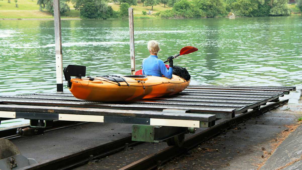 Vor der Halbinsel Rheinau steht das nächste Kraftwerk, das sich schon durch die schwächer werdende Strömung angekündigt hat. Schleppen und Umtragen war gestern – beim Wehr steht ein Übersetzwagen bereit, der über telefonische Anfrage wie von Geisterhand aus der Kraftwerkszentrale bedient wird. Sobald man das Boot auf den Wagen manövriert hat, setzt er sich in Bewegung und befördert einen in Rekordzeit ins Unterwasser. Ganz ohne Anstrengung! Noch zwei Mal haben wir auf der Etappe bis Eglisau die Gelegenheit, diesen genialen Bootslift zu benützen.