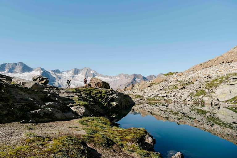 Über stark ausgesetzte und teils seilversicherte Steige führt Etappe 4 vom Furtschaglhaus auf den Gipfel des Schönbichler Horns, das mit 3.134 m den höchsten Punkt entlang des Höhenwegs darstellt. Über Geröll, Almen und Seitenmoränen erreicht man schließlich die festungsgleiche Berliner Hütte (2.044 m).