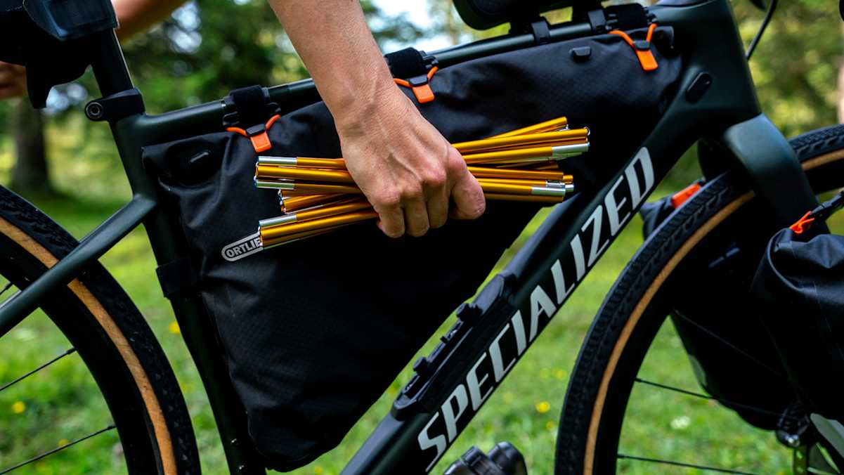 Denn: grundsätzlich immer vor dem Kauf an den Transport denken! Und da ist das Gestänge oft ein Problem, weil es bei normalen Zelten zu lang für Fahrradtaschen sein kann. Deswegen haben spezielle Bikepacking-Zelte kürzere Streben, die man zum Beispiel auch zwischen den Lenker eines Gravelbikes oder Rennrads bekommt.