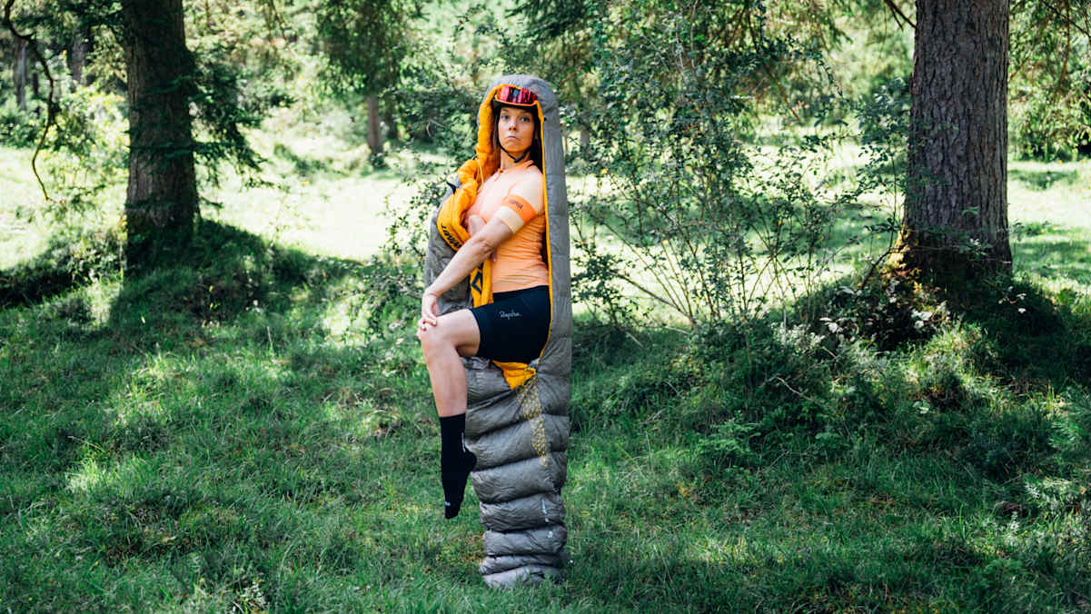 Die grundlegende Entscheidung in Sachen Outdoor-Bettdecke ist: Daune oder Synthetik? Ich bin Team Daune, gerade fürs Bikepacking. Denn Daunen haben das beste Packmaß, weil sie sich extrem klein zusammenquetschen lassen und sind sehr leicht. Da kann man sich im Verhältnis zu Synthetik in beiden Punkten manchmal bis zur Hälfte sparen.