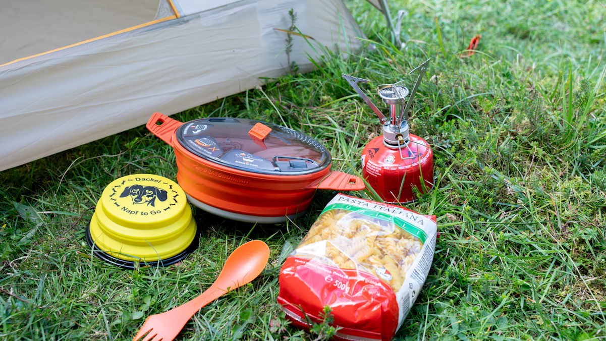 Bei Töpfen gibt es clevere Lösungen wie integrierte Wärmetauscher. Die nutzen die Hitze des Kochers bis zu 50 Prozent effizienter. Gerade auf längeren Touren kann man dadurch eventuell mit einer Gaskartusche weniger auskommen. Und: Falttöpfe- und Schüsseln sollten in der Wertschätzung knapp nach der Erfindung der Glühbirne kommen. Grandios!