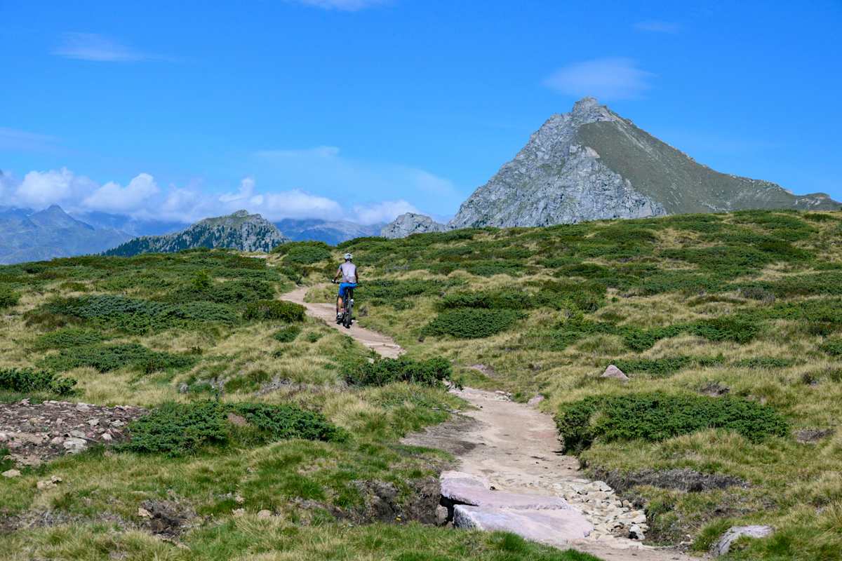 Schöne Tief- und Ausblicke in die Sarntaler Alpen erwarten dich, wenn du von der Bergstation der Seilbahn Meran 2000 bis zum Mittager und weiter zum Kesselberg fährst. Wegen ihrer Länge von rund 18 Kilometern wird die Tour als anspruchsvoll eingestuft, technisch stehen unterschiedliche Streckenführungen zur Auswahl. Etwa 2,5 Stunden und gut 500 Höhenmeter muss man einkalkulieren. Um das Unterfangen bequemer zu gestalten, kannst du ab der Kirchsteiger Alm auch die Aufstiegsanlage benutzen.