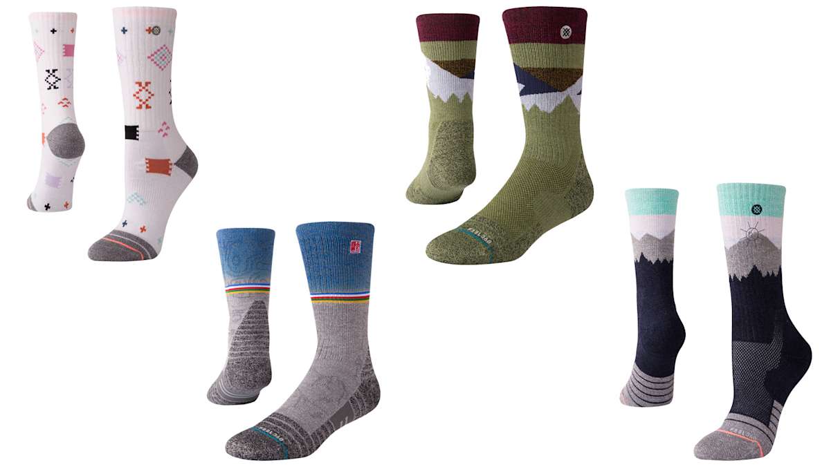 Wer sagt, dass Wandersocken langweilig aussehen müssen? Die Marke Stance wurde vor allem dadurch bekannt, dass sie ein bisher oft vernachlässigtes Accessoire durch auffällige Designs ins Rampenlicht rückte. Bei den Modellen der Hike- und der Trek-Linie wird dabei keine Ausnahme gemacht. Die Socken punkten neben den ausgefallenen Mustern mit der Feel360 Technologie, die je nach Einsatzbereich aus hydrophoben und hydrophilen Fasern (Merinowolle, Polyester, Baumwolle und Nylon) bestehen, oder sogar Silberionen enthalten, die Geruchsbildung verhindern sollen. Die Socken sind übrigens nach der Physiognomie des Fußes geschnitten und die Materialdicke wurde je nach Einsatzbereich (Wandern, Trekking etc.) angepasst.