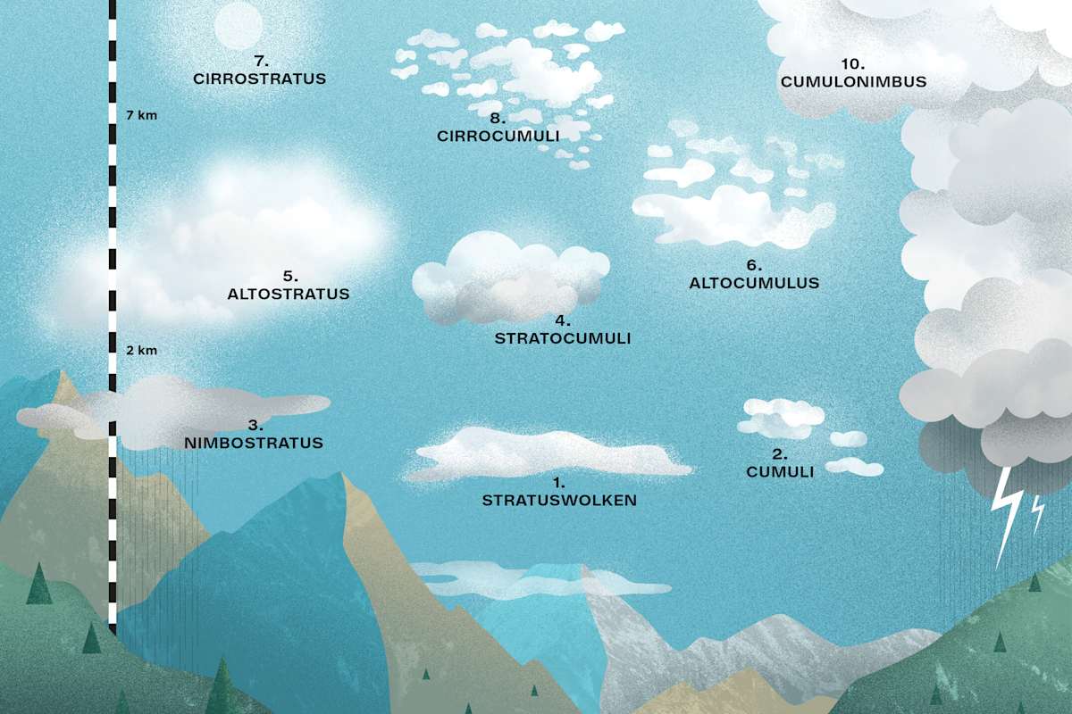 Vom harmlosen Hochnebel bis zu geballten Gewitterwolken: Bevor man eine Tour startet, lohnt sich ein Blick in den Himmel. Wolkenformationen verraten viel über das Wetter der kommenden Stunden – und wirken sich somit aufs Wandern und Bergsteigen aus.